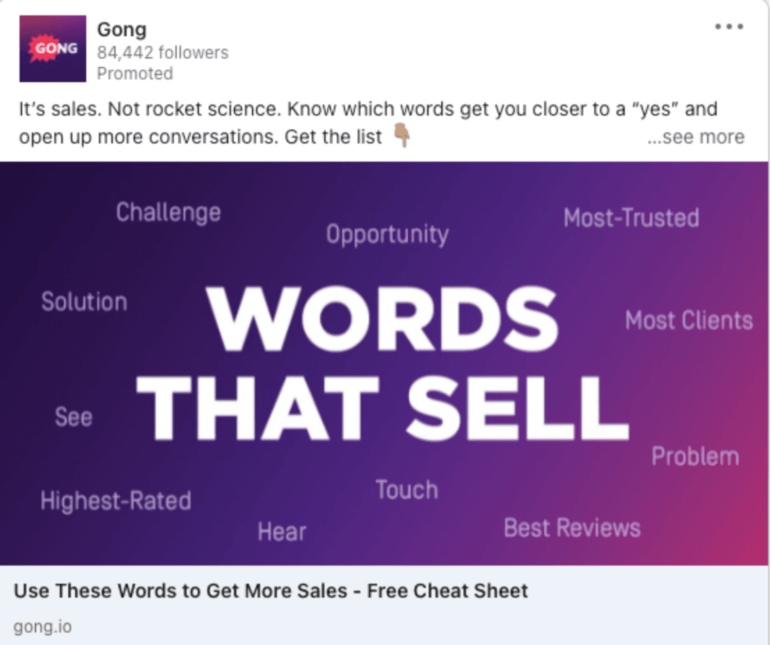 Tune in to how Gong immediately provides value to their readers. This ad catches attention and promotes an effective “cheat-sheet” for sales people. Increase engagement and give the audience what they want, win-win!