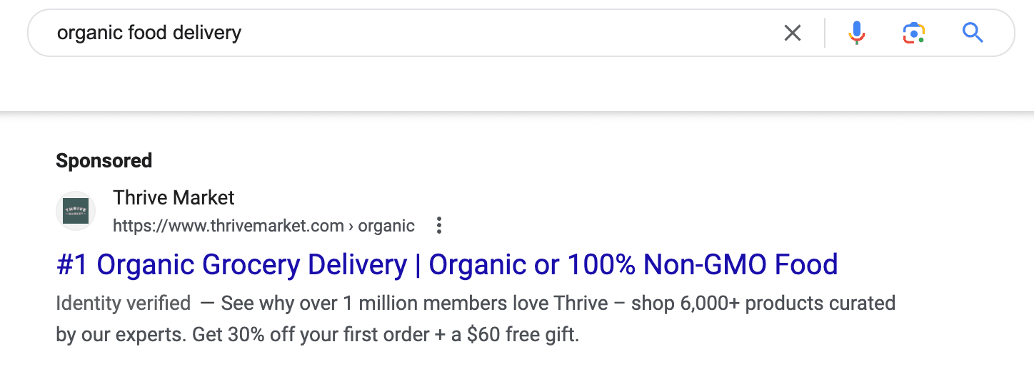 Another example of a top-performing Google ad is from Thrive Market. By including stats and numbers, it evokes a sense of trust between the audience and your brand. The numbers don’t lie and it’ll probe readers to want to learn more about your business.