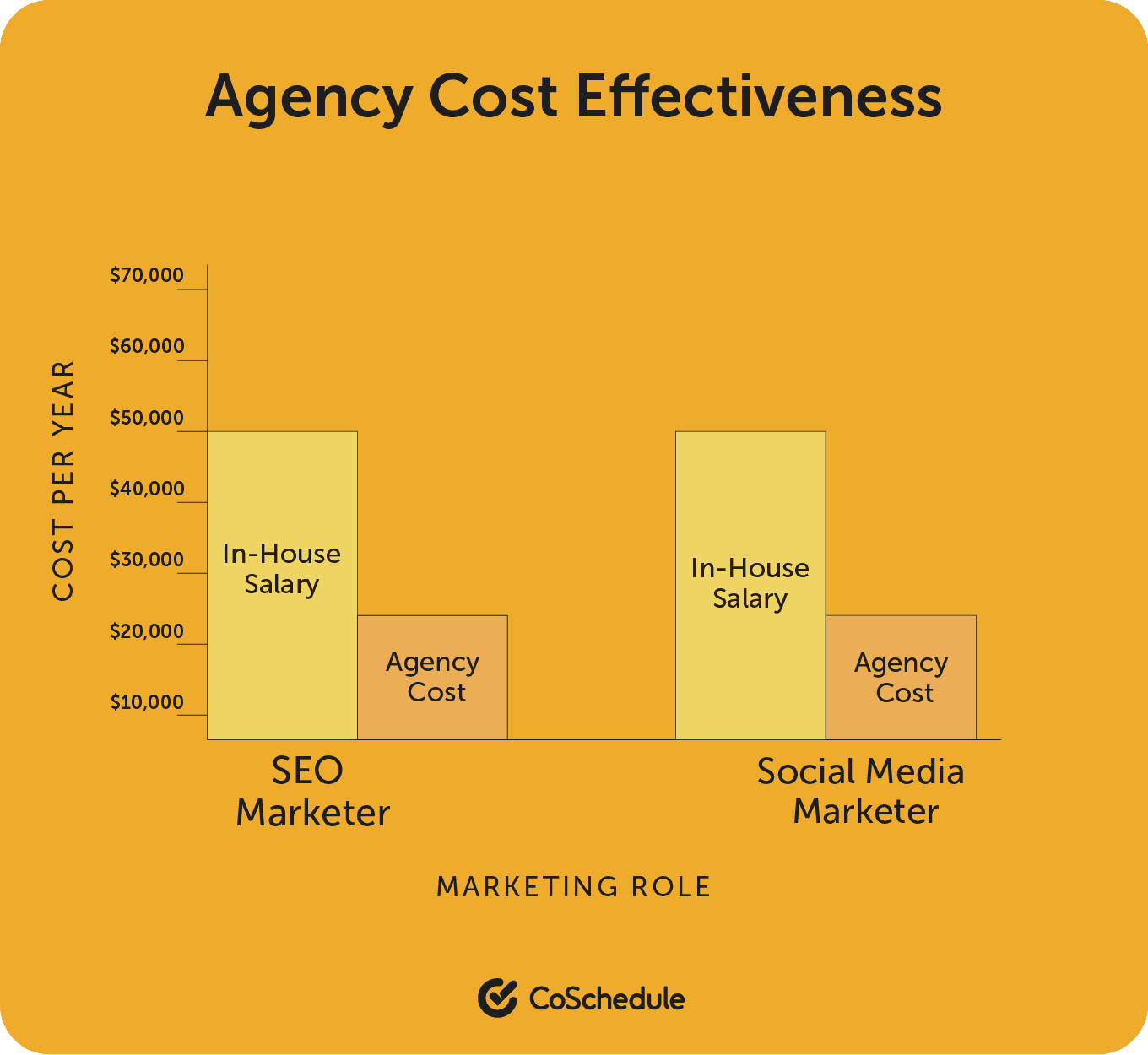 While an agency might seem like a big expense at first, it’s often cheaper than building and maintaining an in-house marketing team. A business may partner with a digital marketing agency for SEO services, which cost around $1500 to $5000 per month or $9000 to $24,000 per year. That’s significantly less than what you would pay an SEO specialist — the average salary is $48,000 or $67,000 with benefits. This allows agency clients to focus their resources on improving their product.
