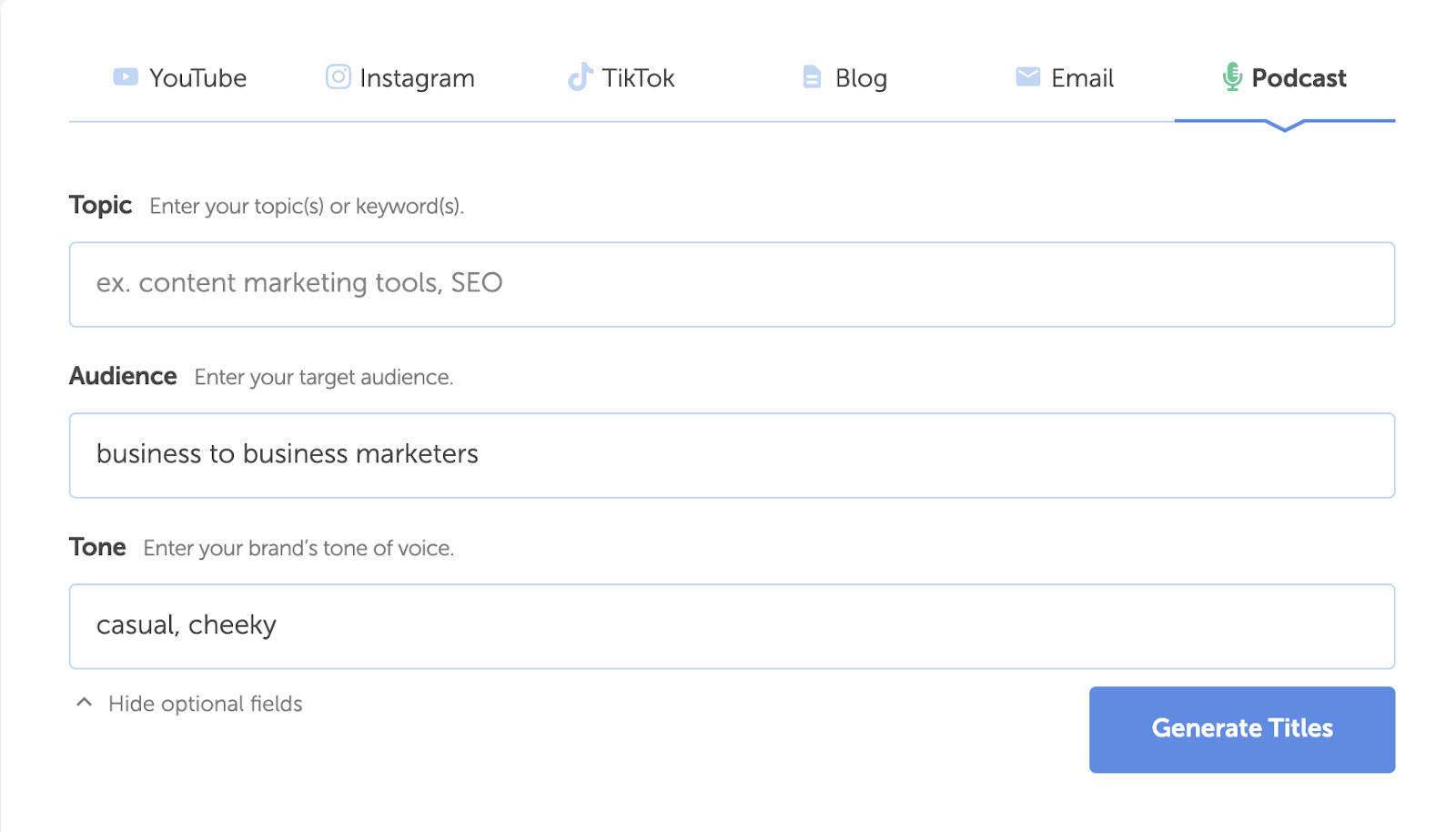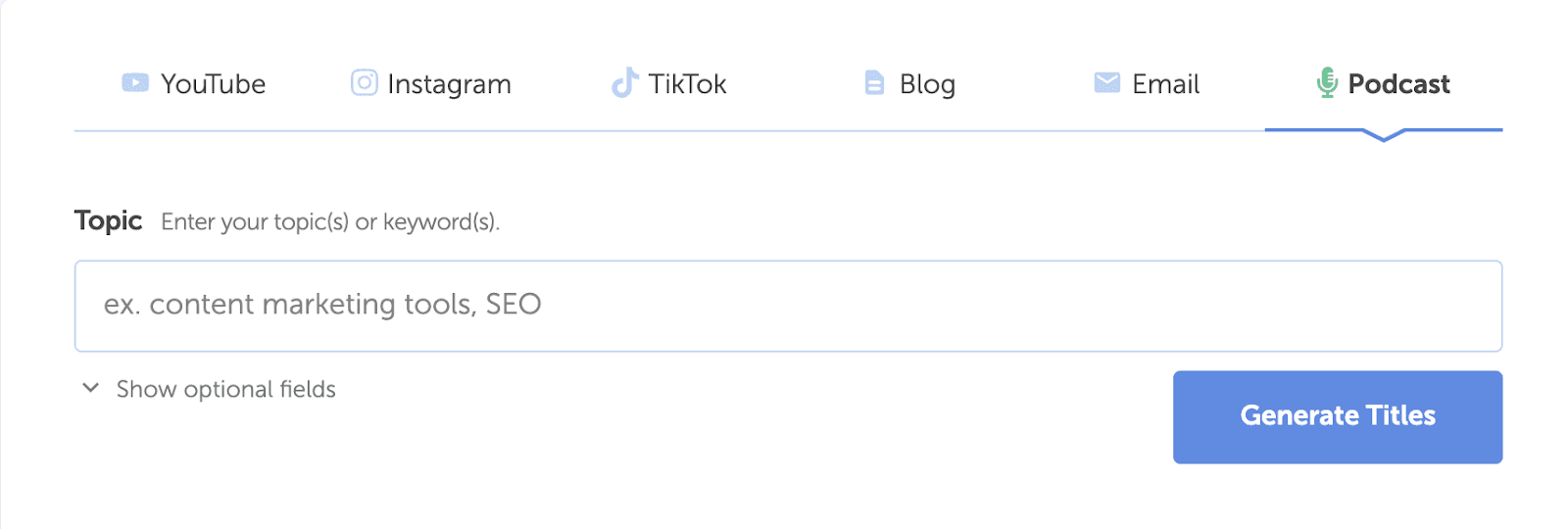 The Podcast Episode Title Generator eliminates the need to think about a title if you intend to rank your podcast in search engines. That’s because each title is SEO-optimized. So if you want to repurpose your podcast into a blog post, grab the transcript, make some tweaks, leave the title as-is, and you’re good to hit publish.