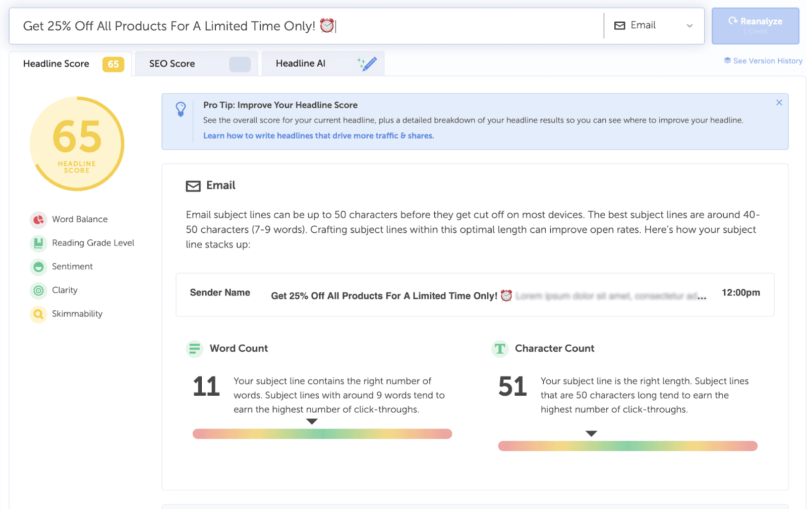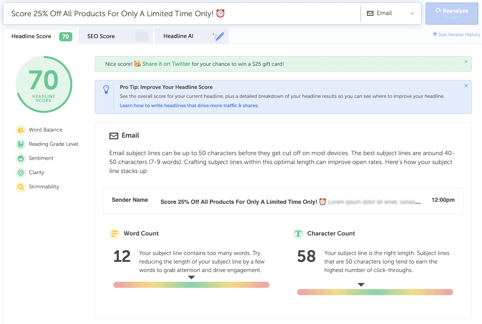 After your subject line is tested, you’ll be presented with the overall score of your subject line. From there, upgrade your subject line based on features like word balance, skimmability, sentiment, and more.