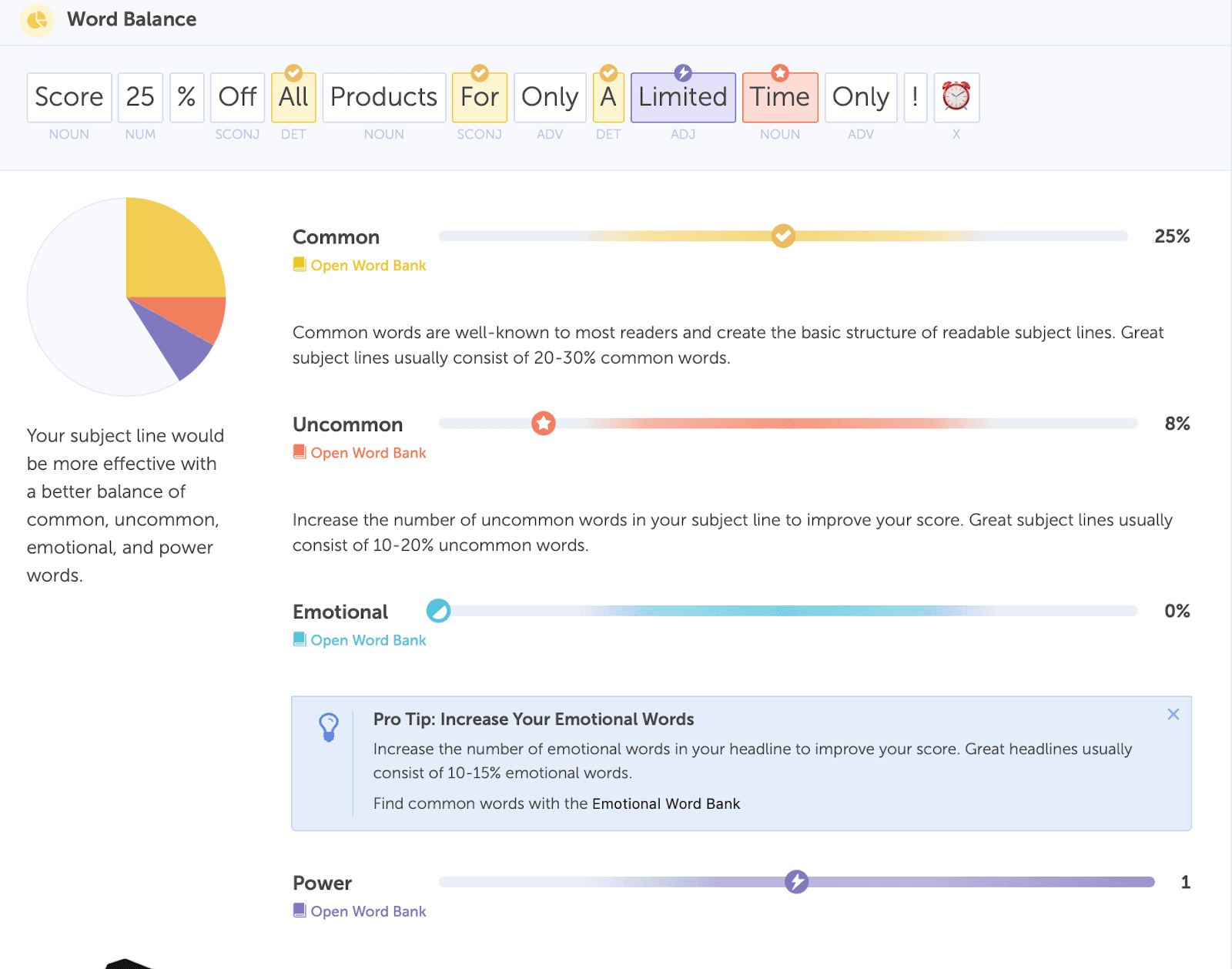 Here’s an example of possible scoring with your keywords. Email subject line tester will touch base on common, uncommon, emotional, and power keywords. Any area that has a low score, you can dive into a word bank and try to incorporate those options into your subject line.