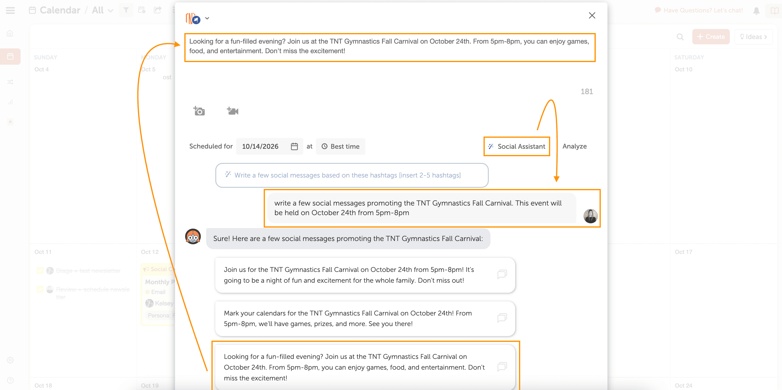 Personalize each message in your social template to suit the details of your event. Feeling uninspired? Use AI Social Assistant to help generate copy for social messages.