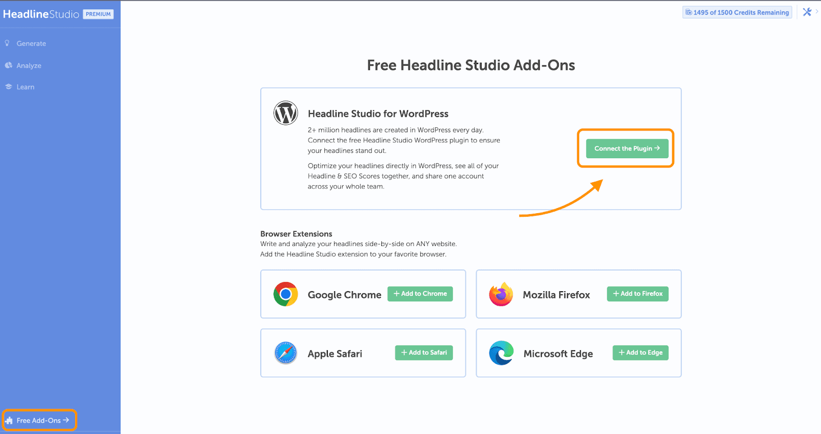 You can analyze your headlines in WordPress by connecting your plugin to your WordPress account. You can do this by clicking “Free Ad-Ons” in the bottom left corner of your Headline Studio account.