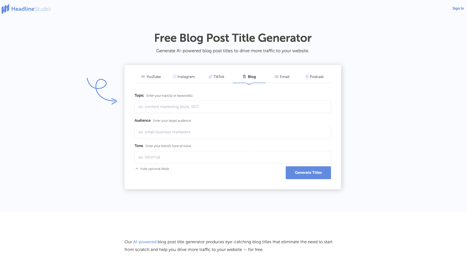 CoSchedule offers free title and caption generators for YouTube videos, Instagram posts, TikTok posts, Blog posts, Emails, and Podcasts. Simply type in your topic, audience, and tone, and instantly generate great title/caption options that you can use. Better yet, you can optimize them in Headline Studio to receive a score and feedback on how you can improve your titles and captions.