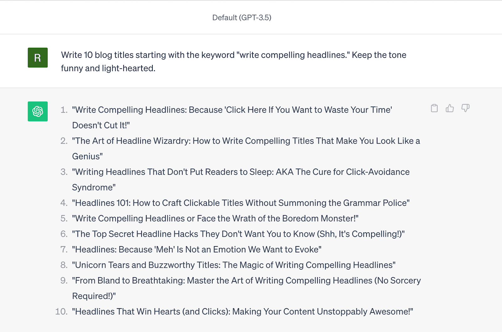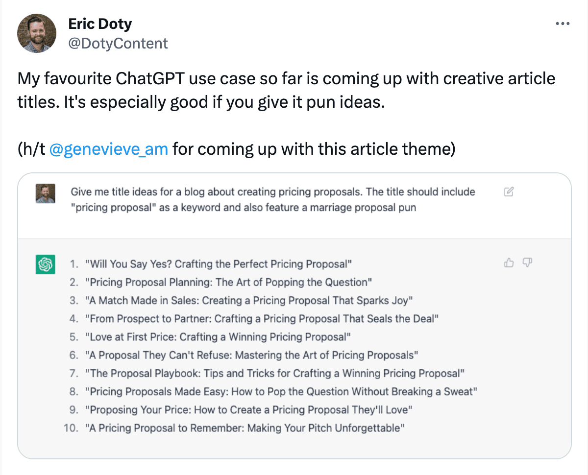 For example, Eric Doty instructed AI to use puns in his prompt for creative titles. Whether or not you’re giving prompts on ChatGPT, don’t be afraid of providing out-of-the-box prompts to generate fresh headlines.