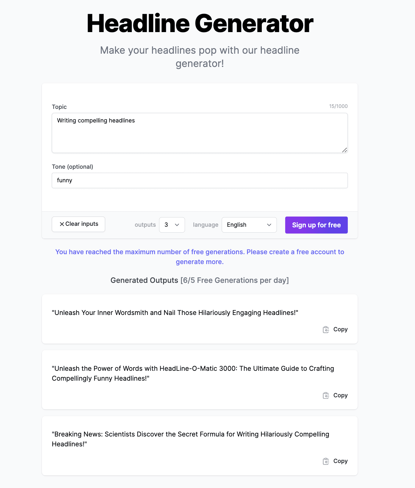 Do some trial and error to see what prompt gives you the best results. In any scenario, your goal is to feed the AI headline generator with as much info as possible to provide you with the best results.