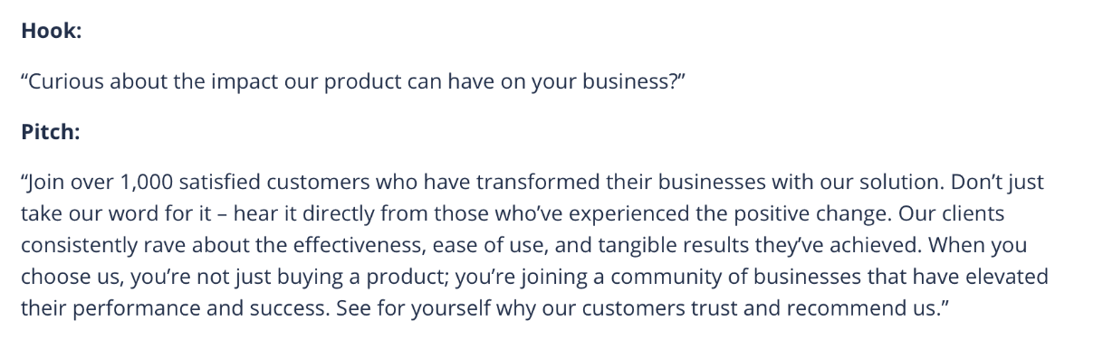 Although product pitches are similar to a sales pitch, there’s a strong emphasis on the goods and services you provide. This allows you the chance to dive into pricing, discounts/memberships, and extra features that make your product the best.