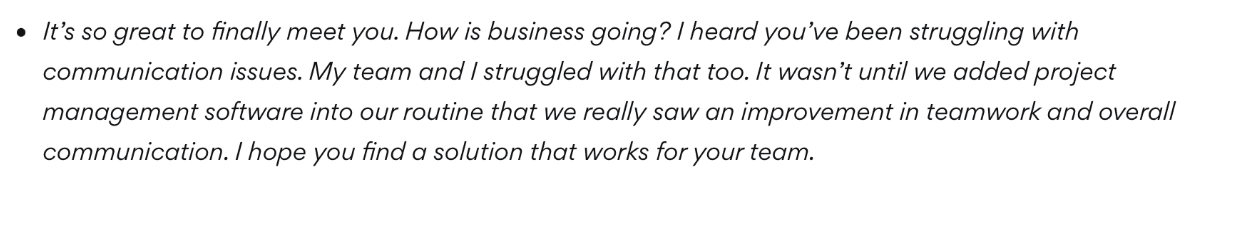 In the following example, you see the sender touching base on a mutually experienced problem and then offering the recipient a solution. Probing the receipt to look into their services and purchase their product.