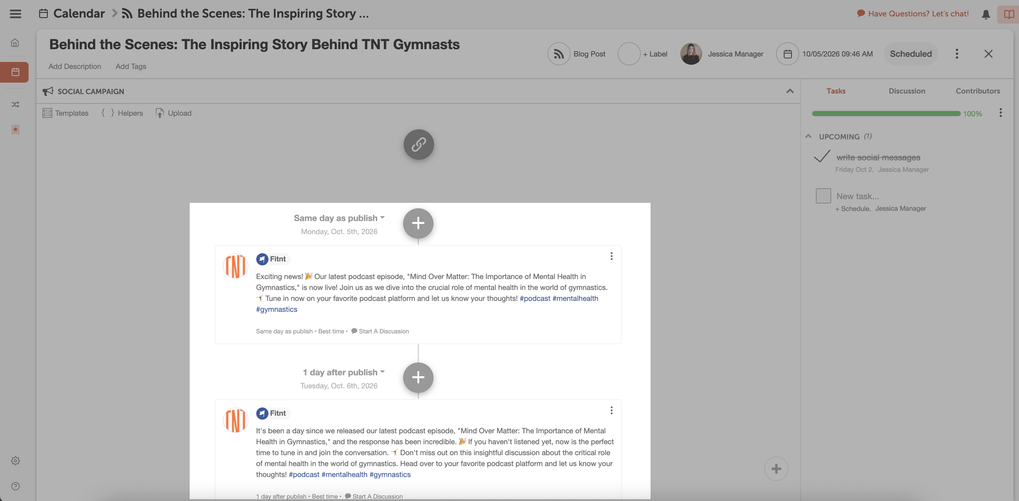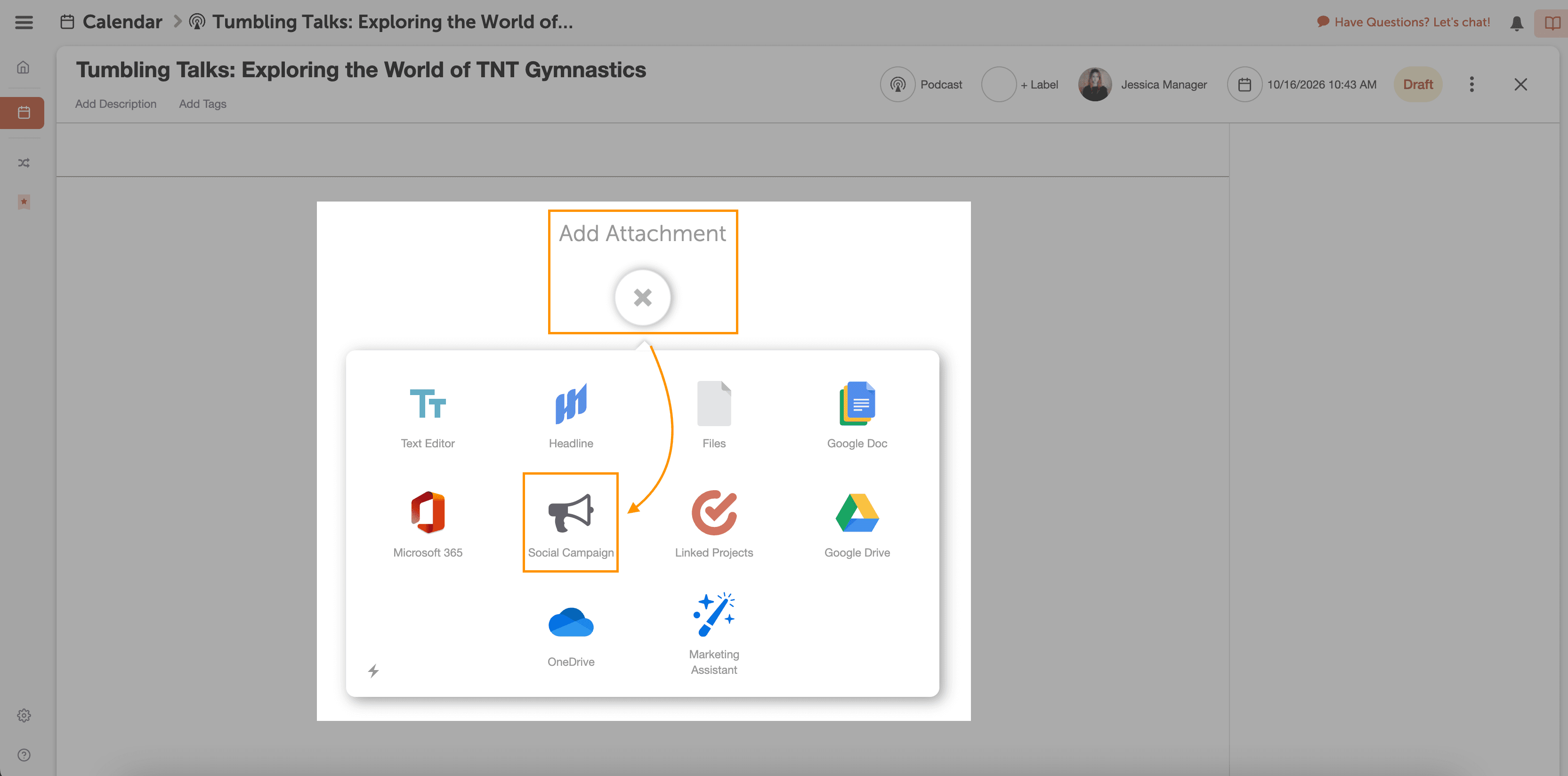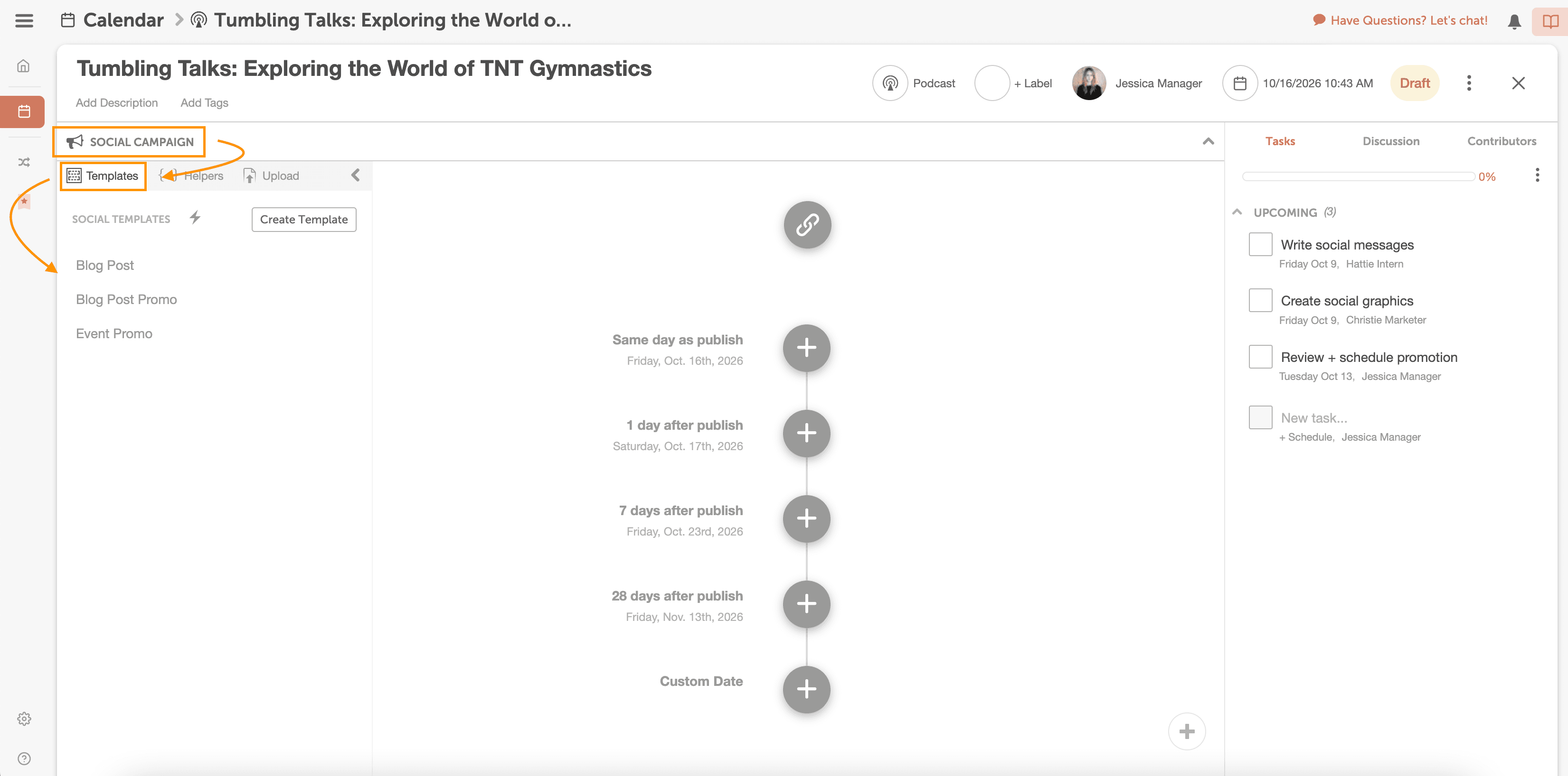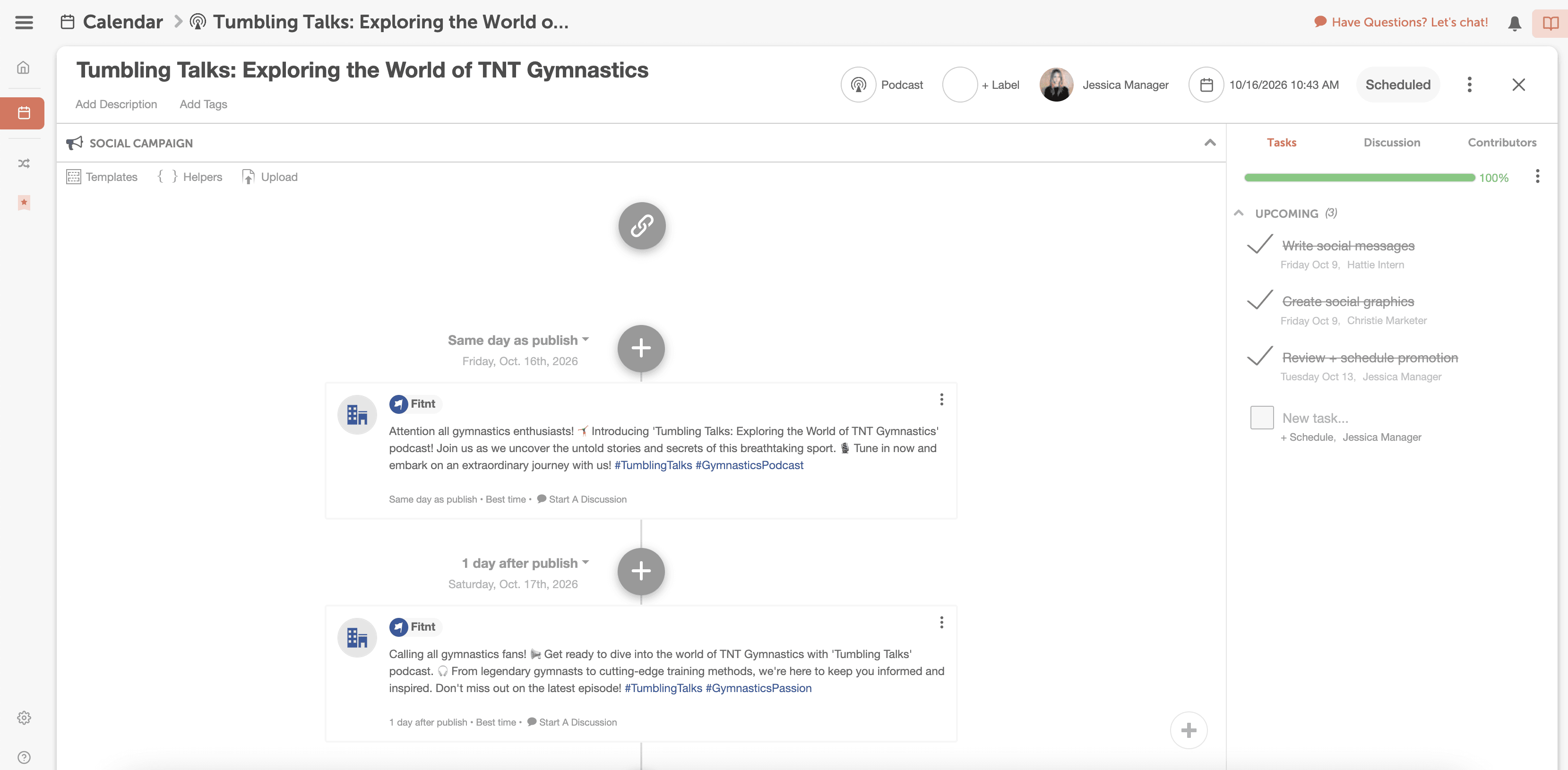 Seamlessly integrate your podcast promotion by adding a social campaign to your Podcast Episode project or create a standalone campaign on your Calendar.