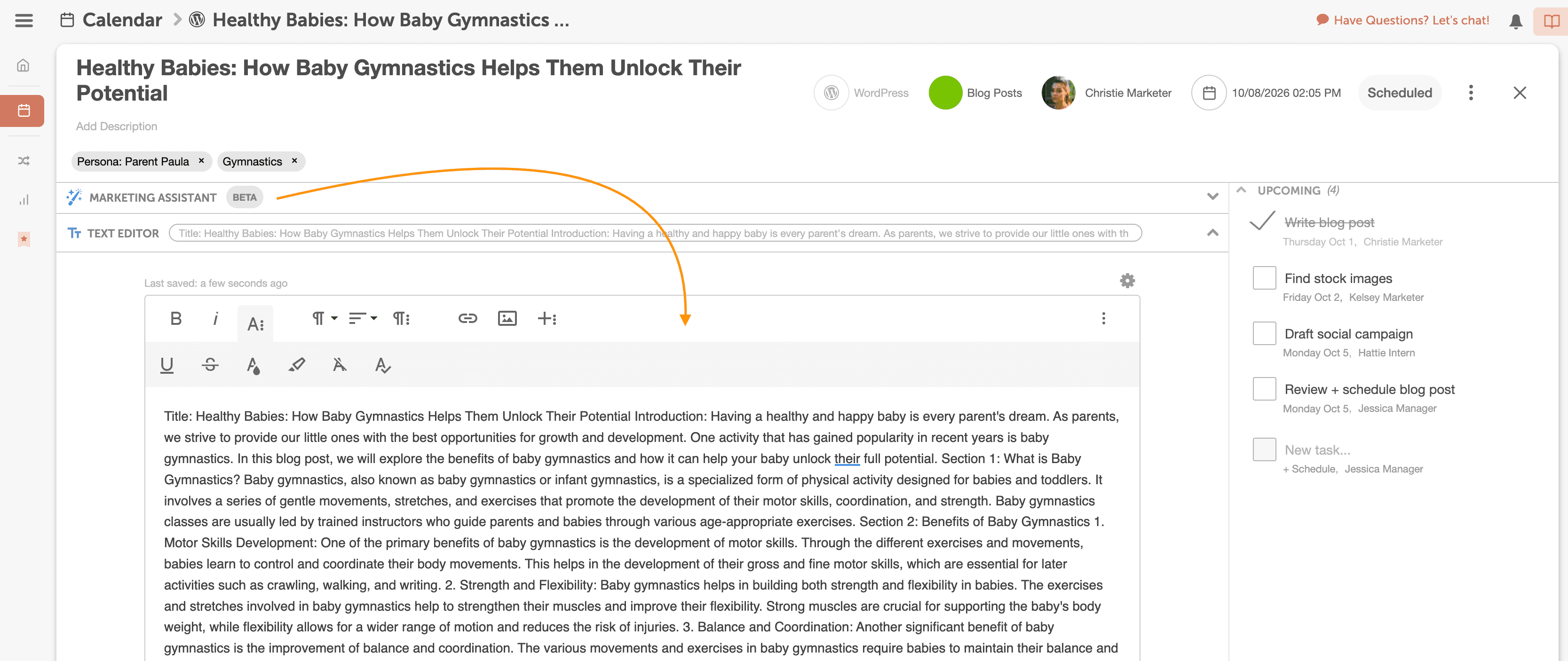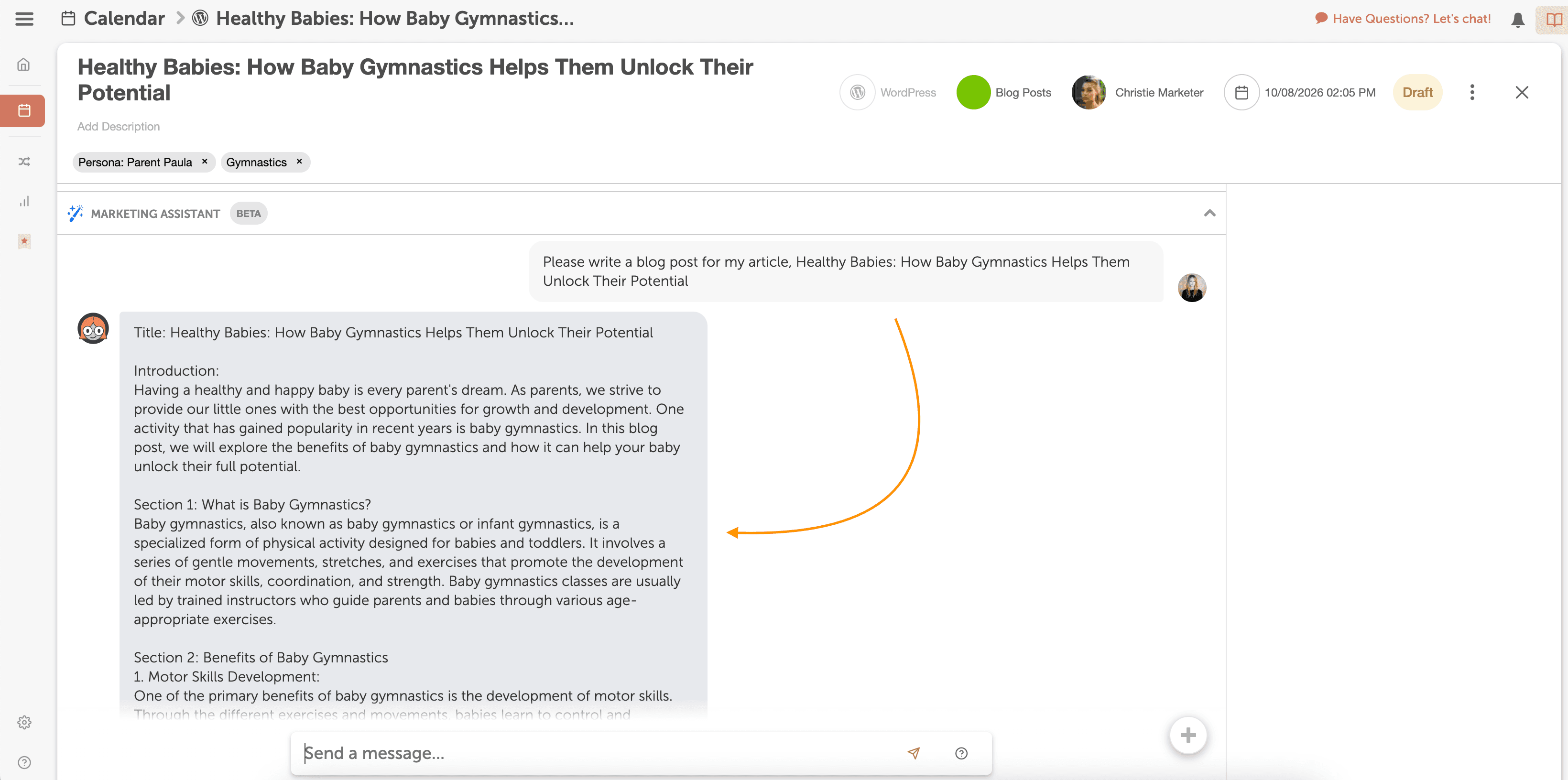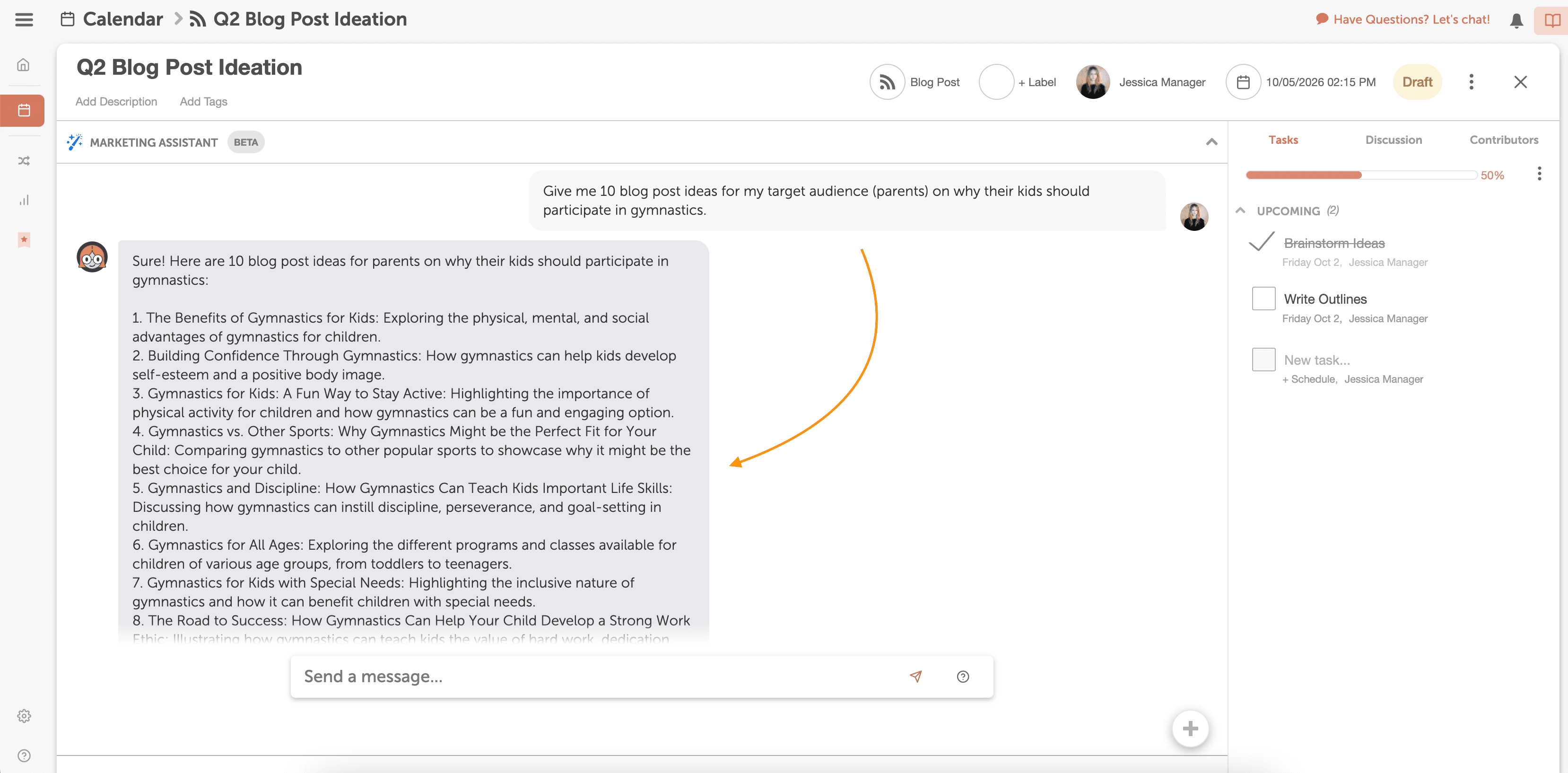 Now it’s time to write your blog post. CoSchedule’s AI-Powered Marketing Assistant, Mia, can help create your first draft. Just give Mia direction about what your blog post is about, and she’ll give you suggestions to help you get started.