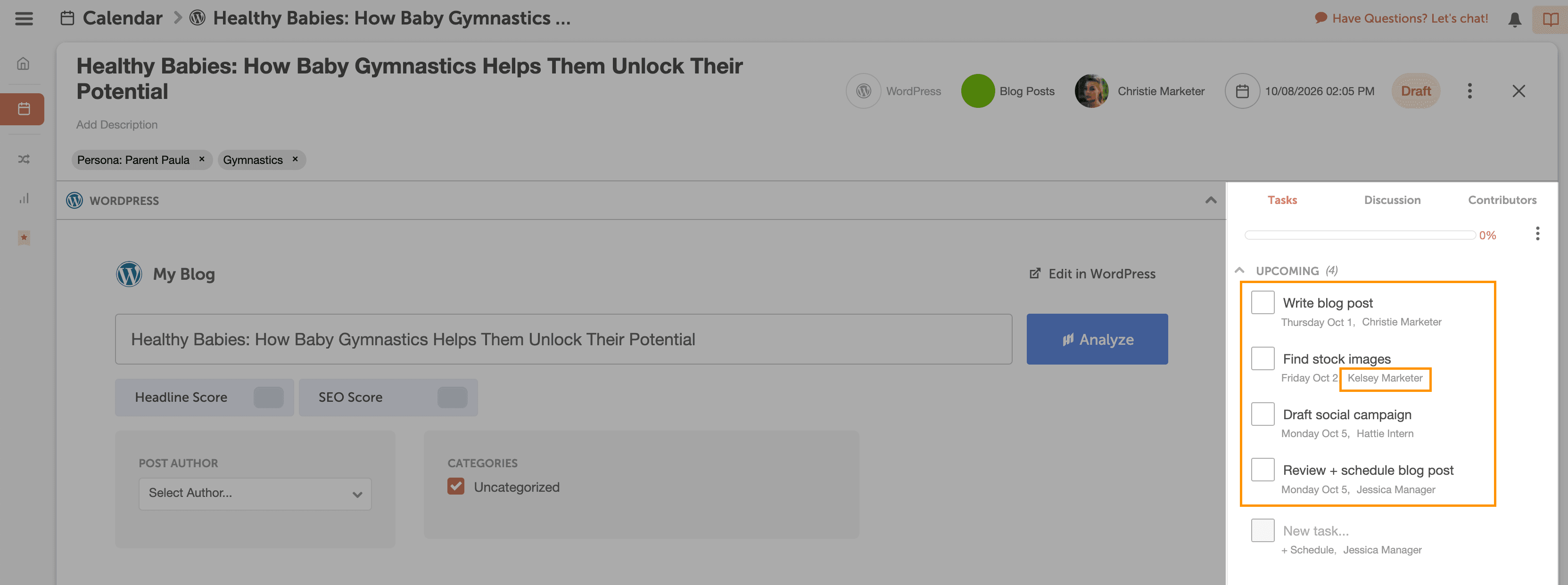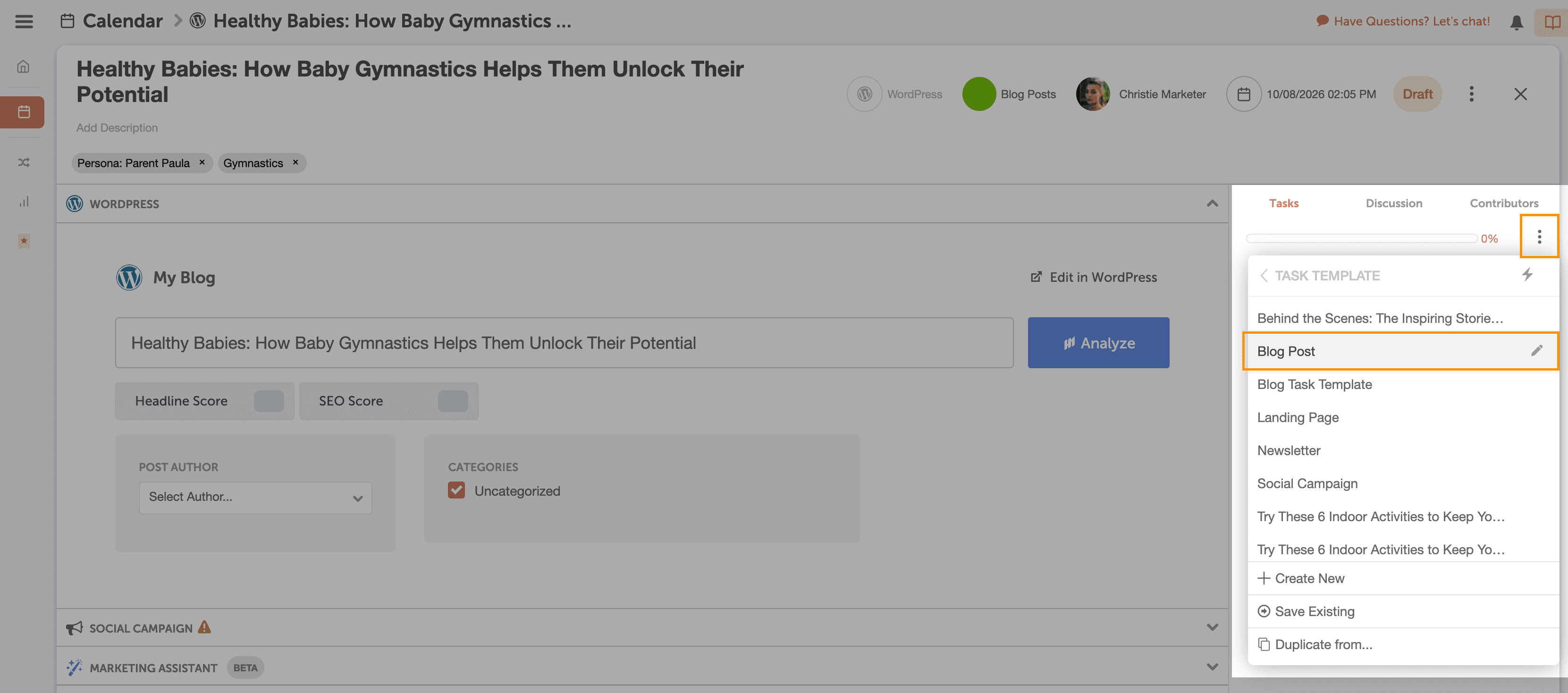 To make sure your blog posts are ready to publish on time, assign a reusable task template to assign tasks to yourself (and team).