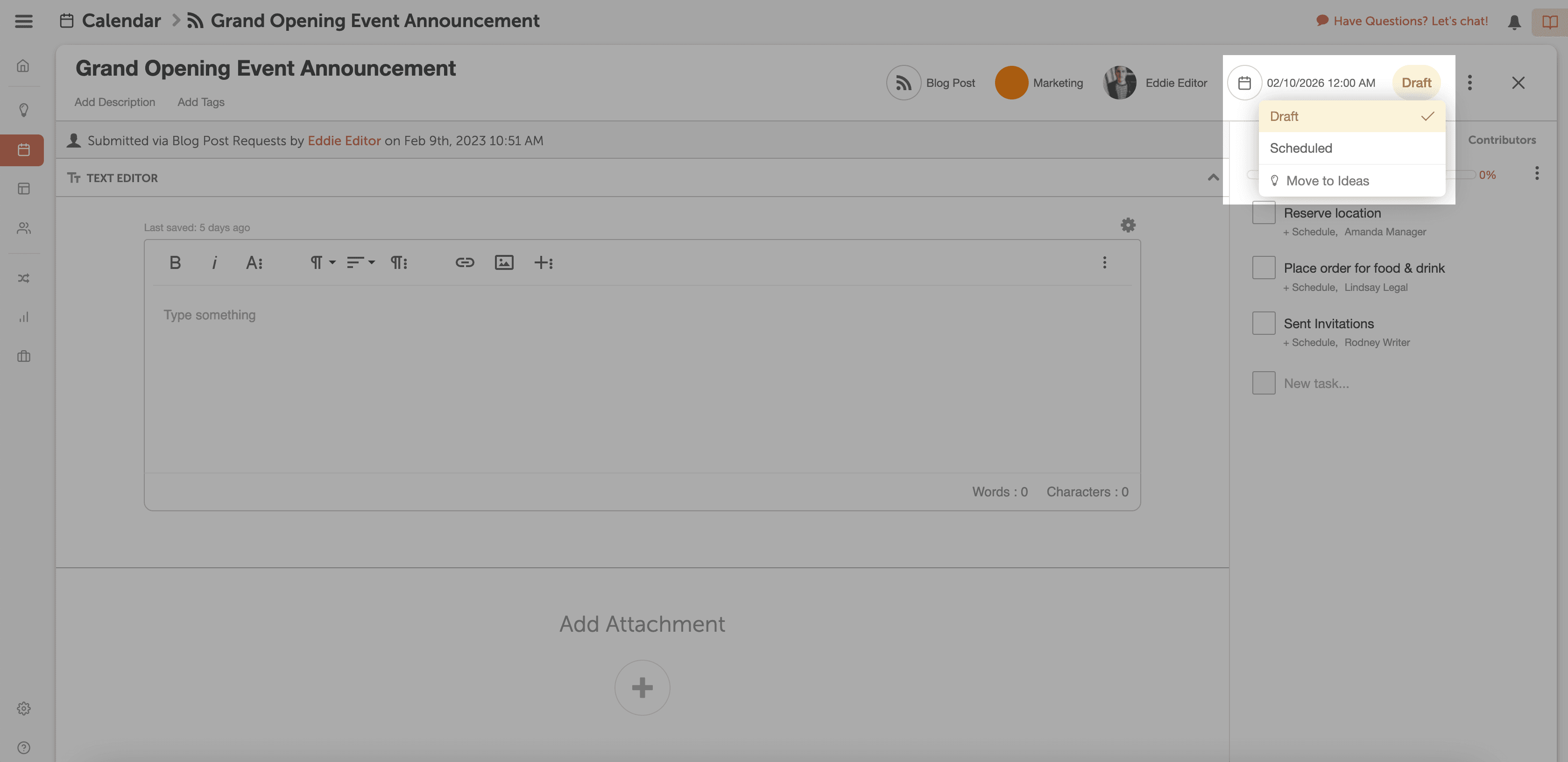 Say goodbye to tedious manual scheduling. With CoSchedule Calendar products, simply change the status of your social messages from draft to scheduled.