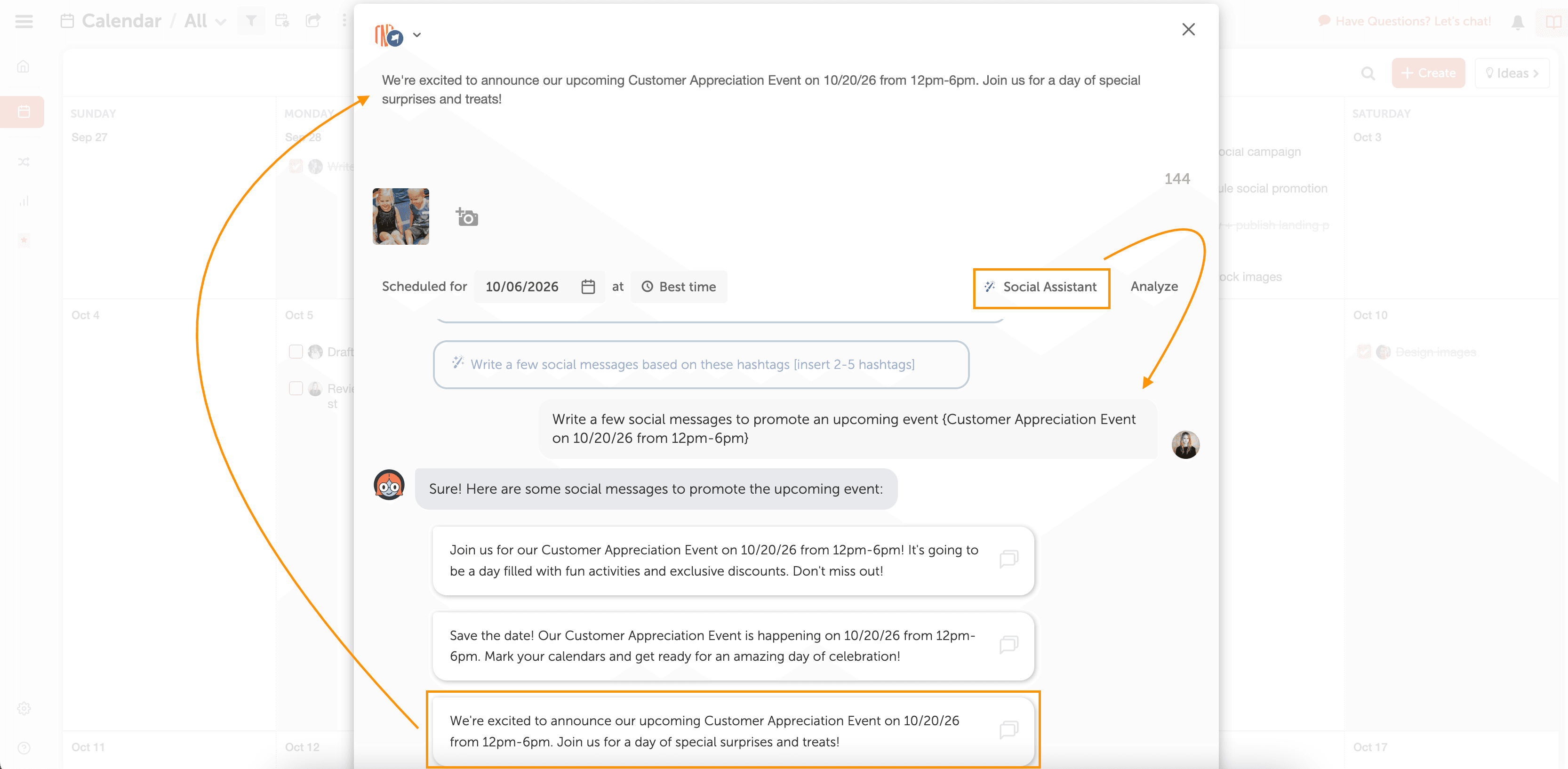 Use CoSchedule’s AI Social Assistant to instantly draft social messages for you, saving you time to focus on strategy instead of writing copy.