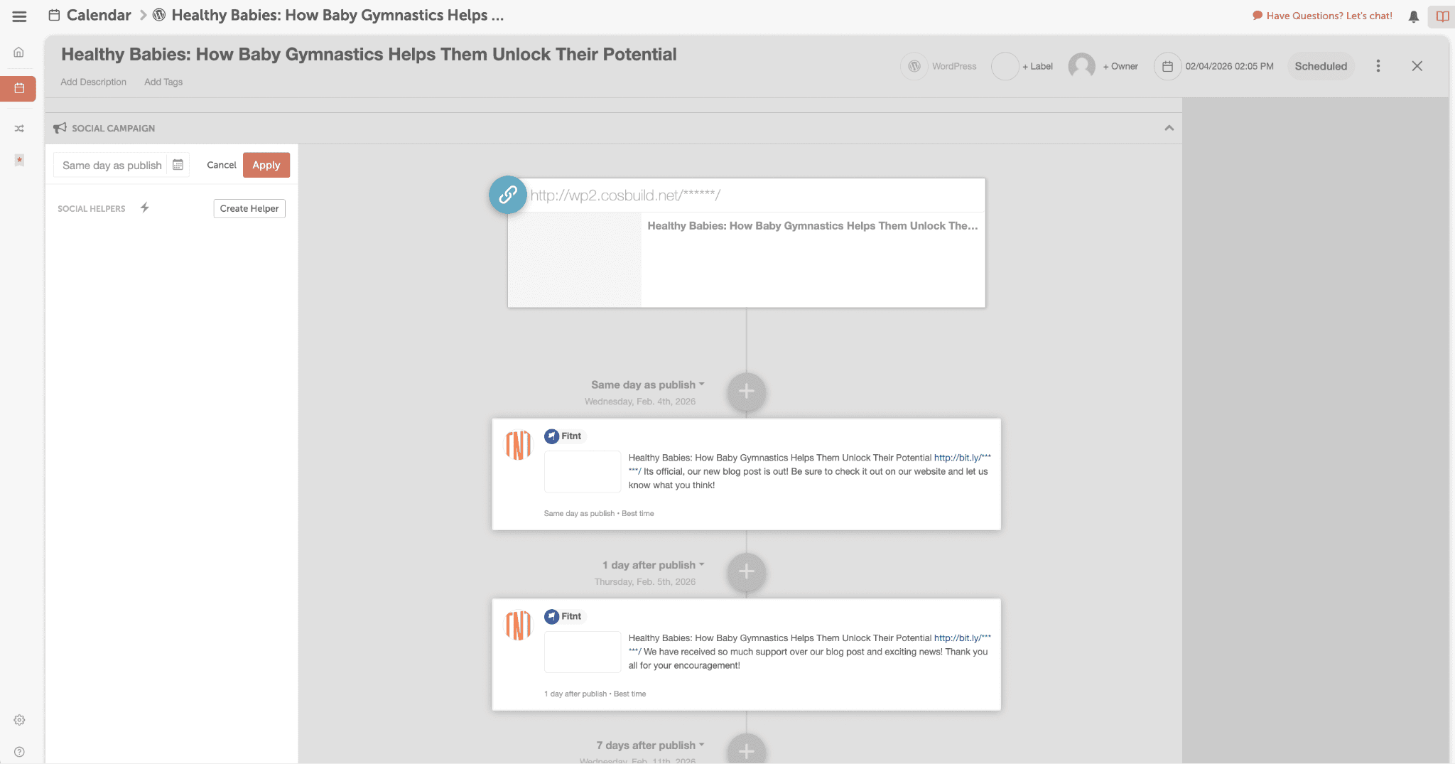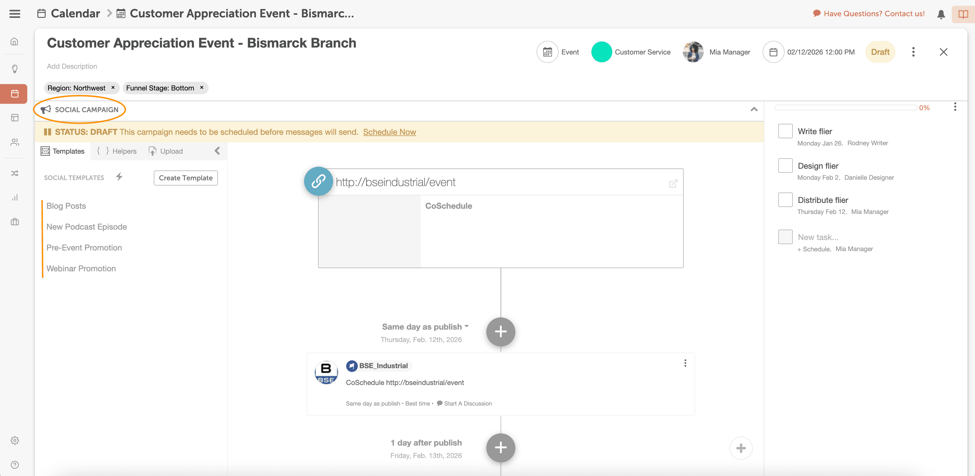 You can add social campaigns to any project or event on your CoSchedule Calendar. This makes it easy to consistently promote new projects or events.