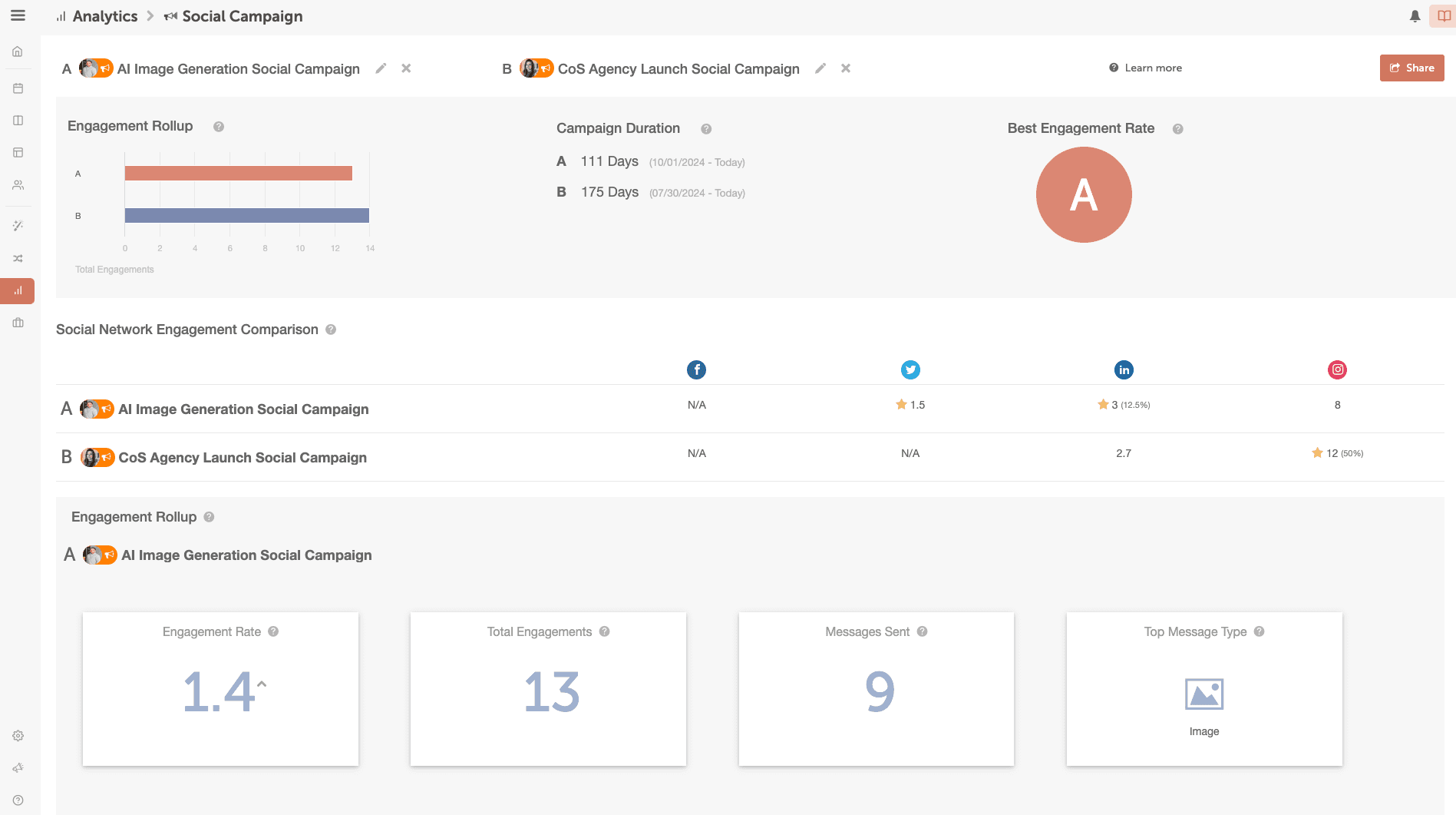 This makes it easy to generate social media reports for specific campaigns, promotions, or initiatives – regardless of how or where you publish your social messages. Create a Social Campaign Report in Analytics to report on all of your campaign’s social promotion efforts!