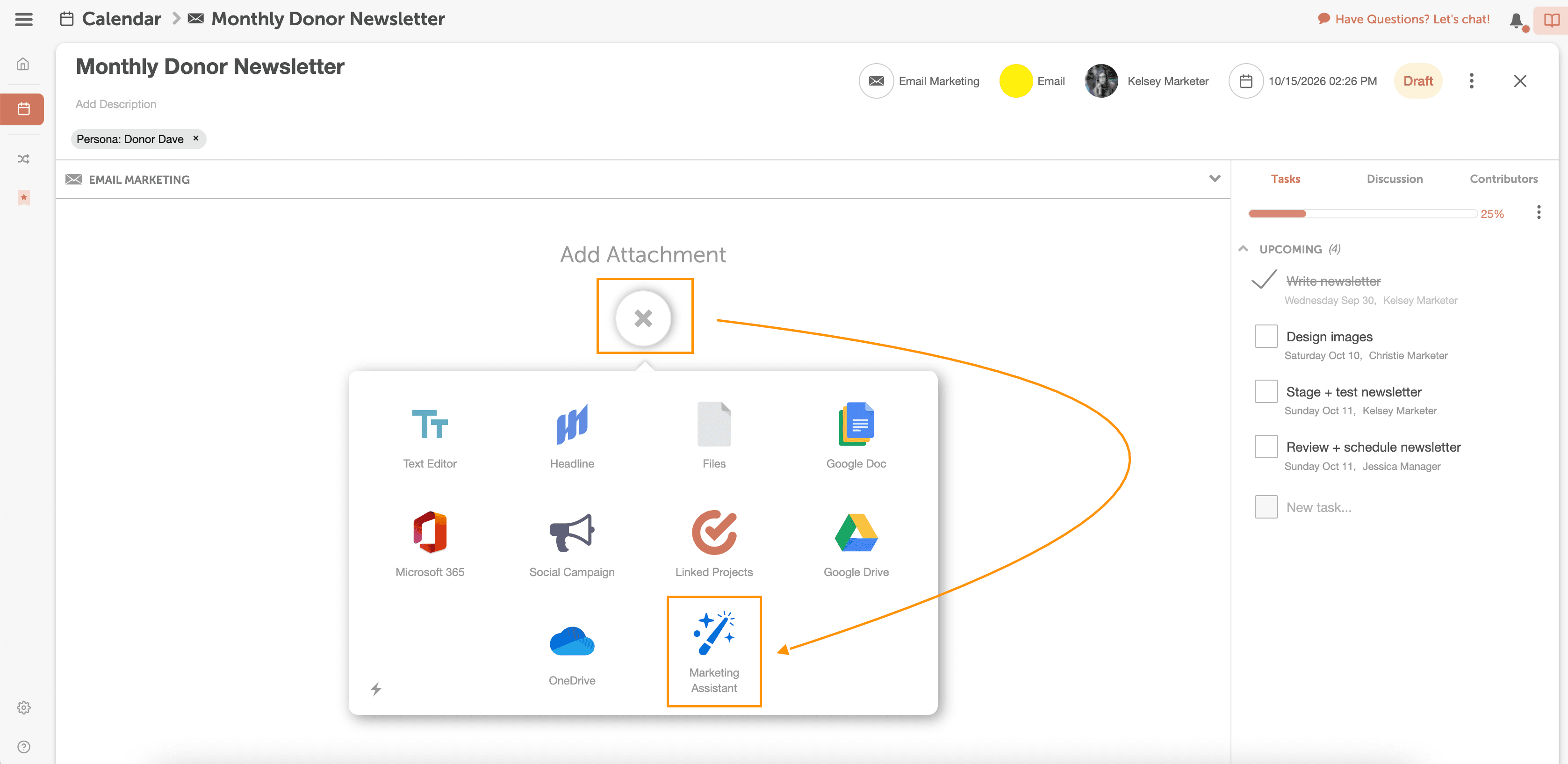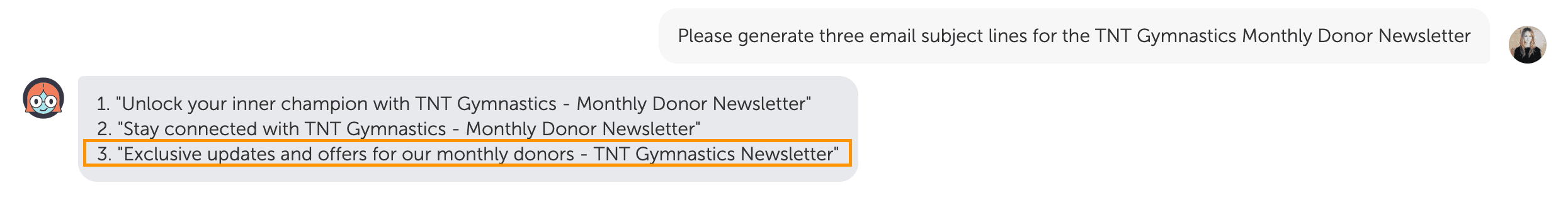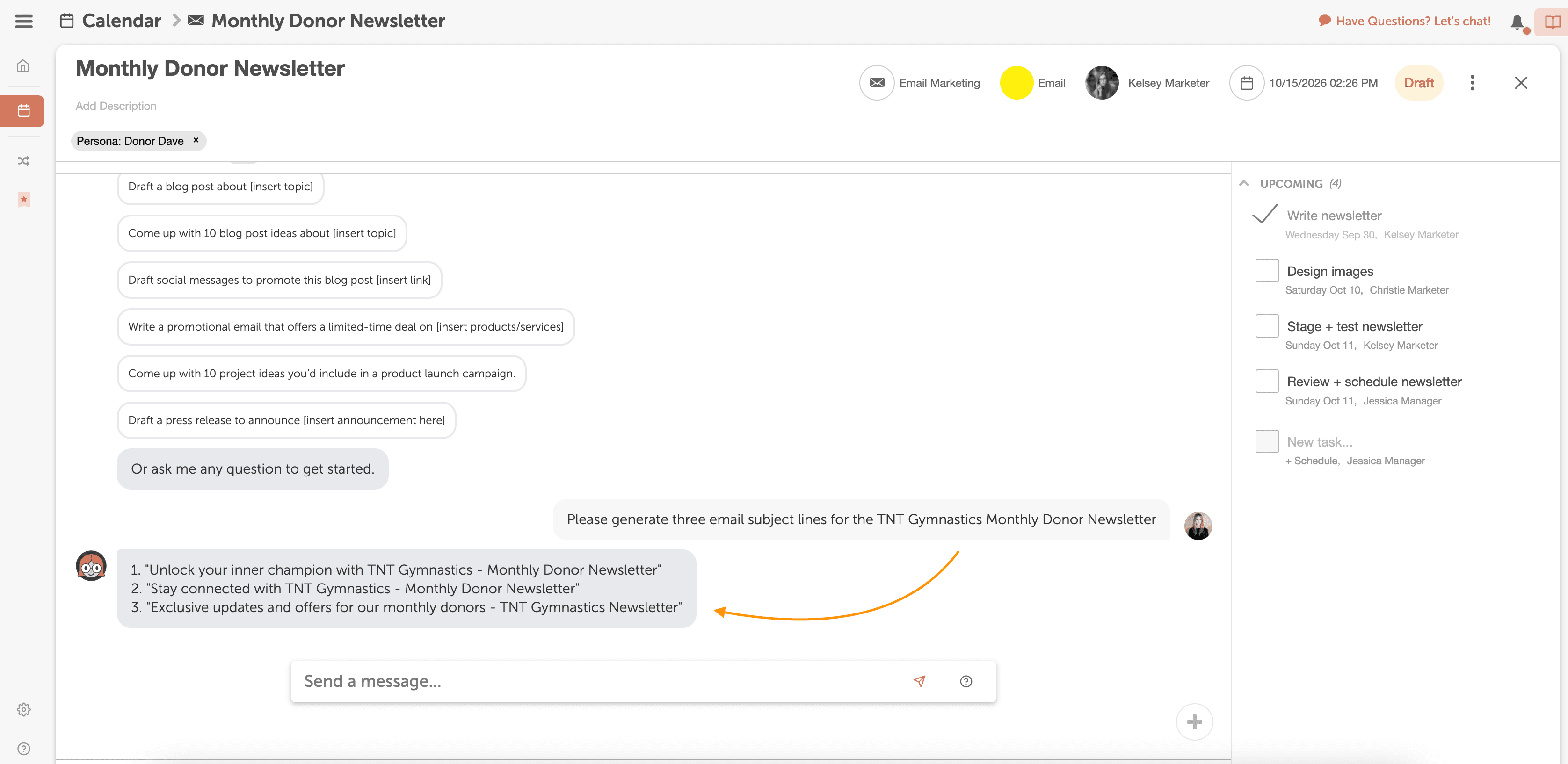 Add the Marketing Assistant Attachment to your project and ask Mia to generate subject line ideas for your email subject lines.