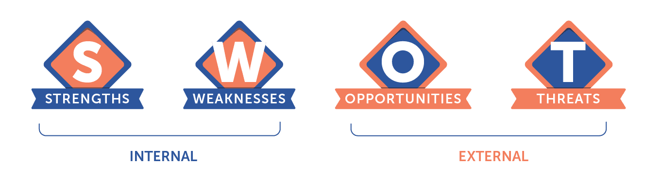 Your “strengths and weaknesses” are internal factors within your control, and “opportunities and threats” are external factors like market and competition outside your control.