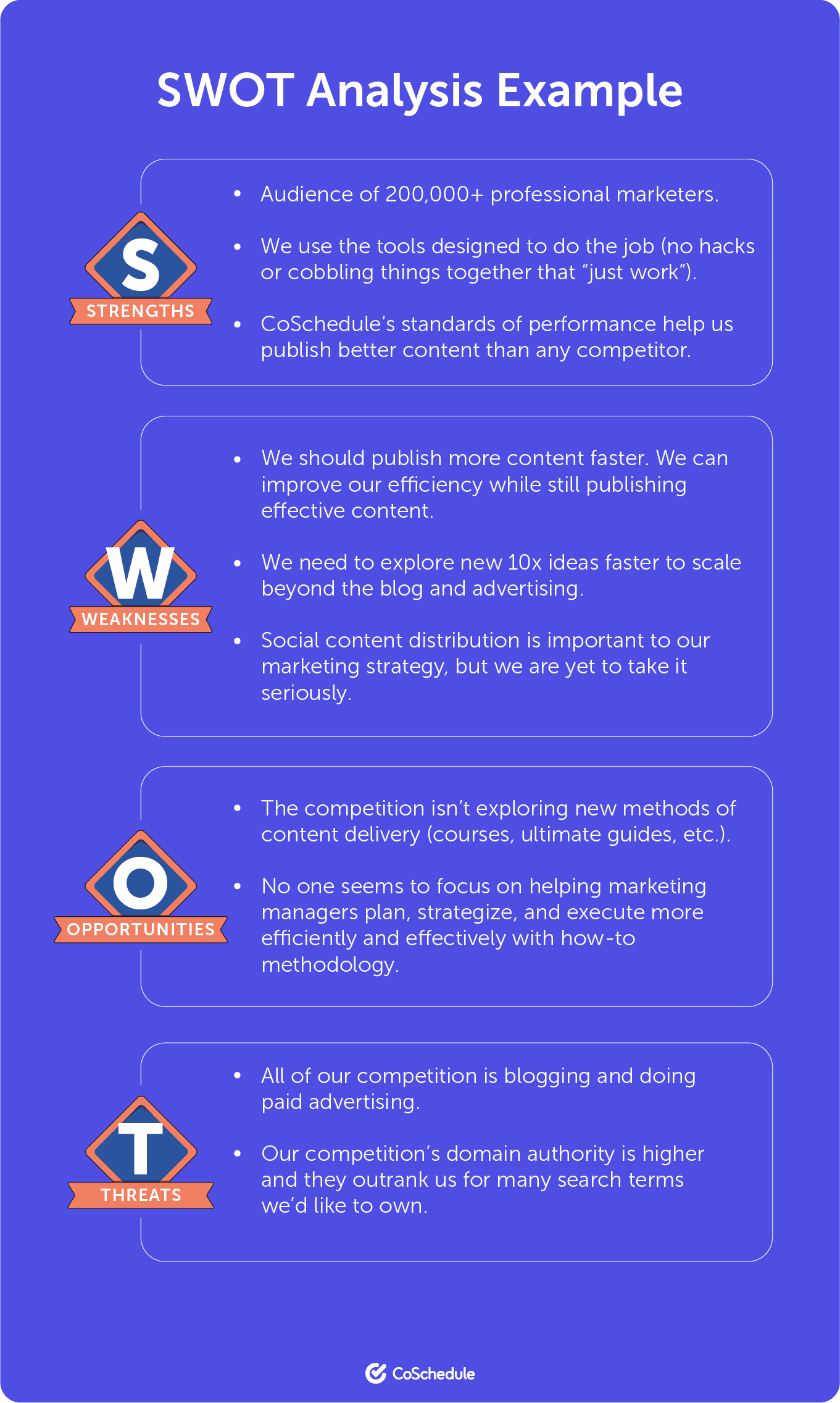 Let’s assume we have an objective of driving 6,000 marketing-qualified leads to CoSchedule in 6 months. The SWOT Analysis may look like this: