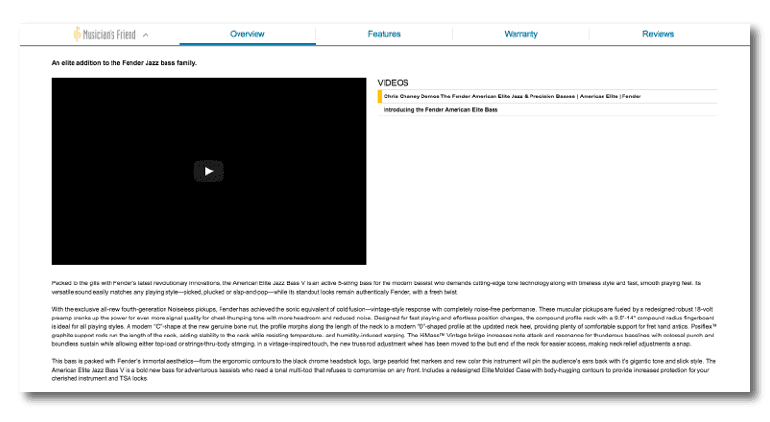 The last step in your content creation process is adding and reviewing any videos that need to be on your new webpage. Much like images, videos are not always a necessary part of your webpage but if you decide to add one in your need to call this out to your developer. Videos should be used sparingly and only when it adds to the knowledge of your reader, like this video that was added on to Musician's Friend to demonstrate a product: