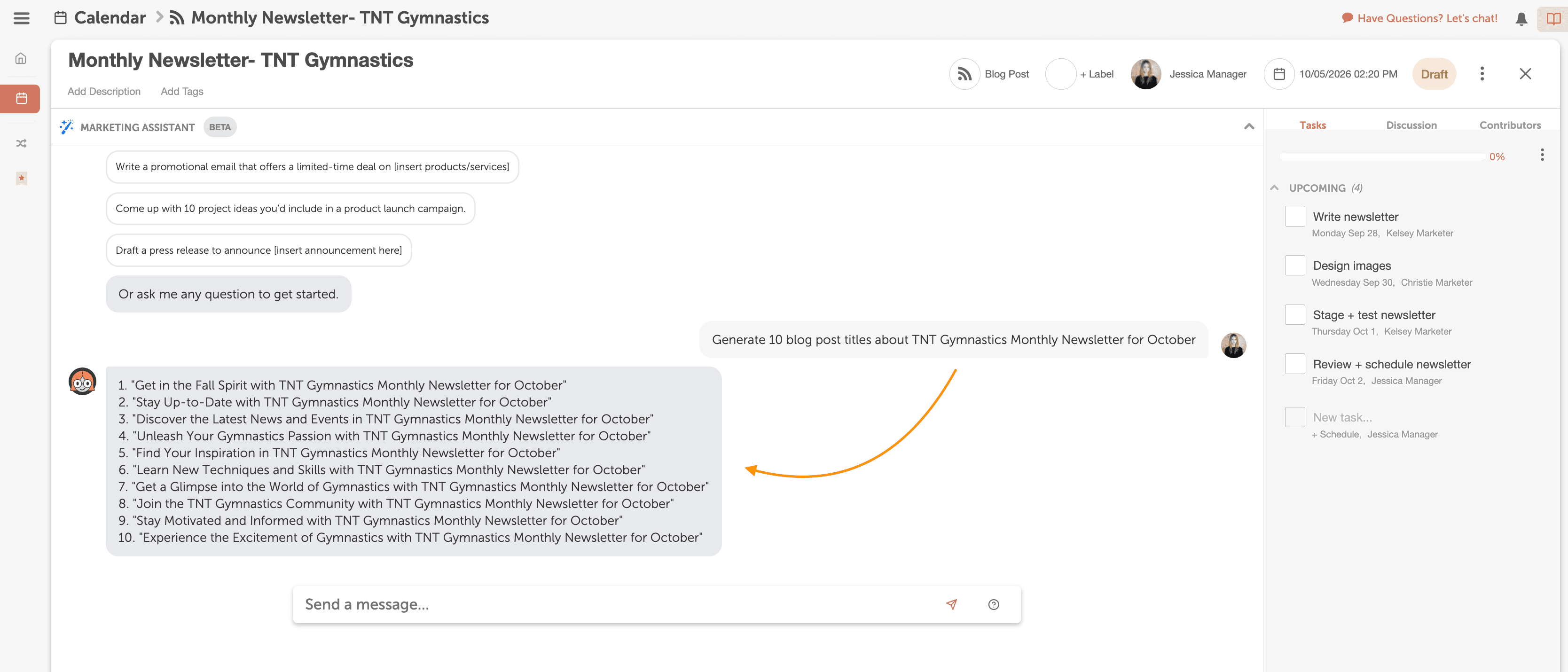 Ask Mia a question or give her a prompt like, “Generate 10 blog post titles about [topic],” and let the AI Assistant come up with ideas for you.